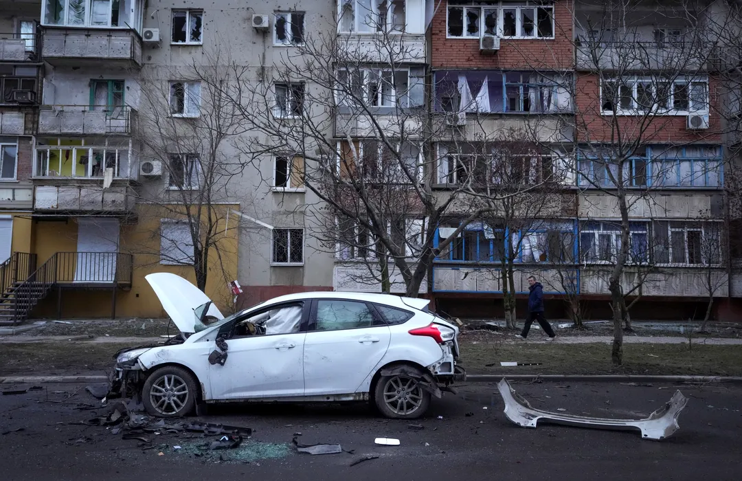 A man walks past a damaged vehicle and debris following Russian shelling in Mariupol, Ukraine, Thursday, Feb. 24, 2022. Russia has launched a barrage of air and missile strikes on Ukraine early Thursday and Ukrainian officials said that Russian troops have rolled into the country from the north, east and south. (AP Photo/Sergei Grits)