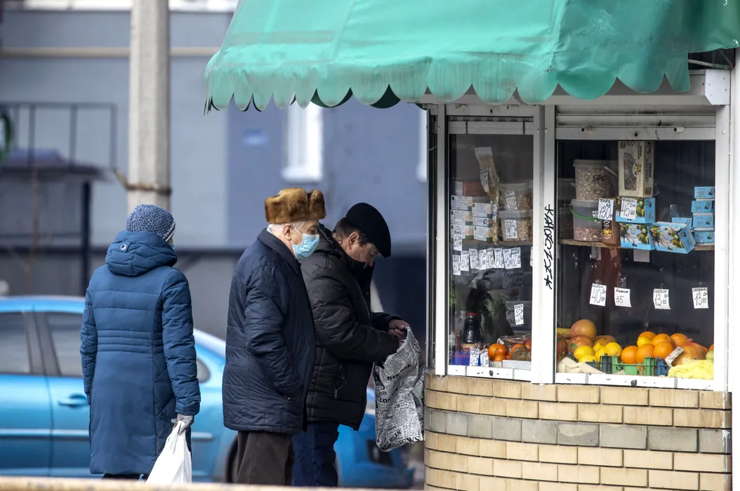 KRAMATORSK, UKRAINE - FEBRUARY 24: People purchase food from a buffet in Kramatorsk city in eastern Ukraine's Donbas region on February 24, 2022. Aytac Unal / Anadolu Agency/ABACAPRESS.COM