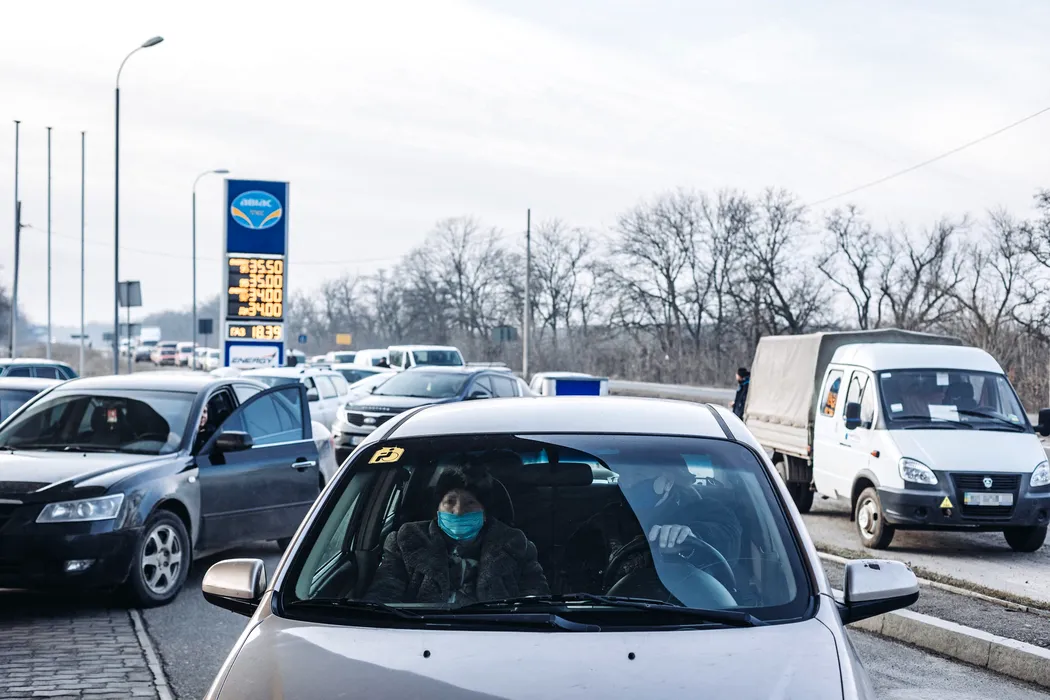Vehicles in Kramatorsk, located in Donetsk Oblast, eastern Ukraine, drive to a gas station, in Kramatorsk, Ukraine, February 24, 2022. The Ukrainian population is moving to safer places after several explosions in different cities. In particular, according to the Unian news agency, at least four explosions have been reported in Kramatorsk. In addition, Russian troops have landed in Odessa and artillery shelling has taken place on the border following the announcement by the Russian president to launch a military operation in the Donbas region. Photo by Diego Herrera/Europa Press/ABACAPRESS.COM