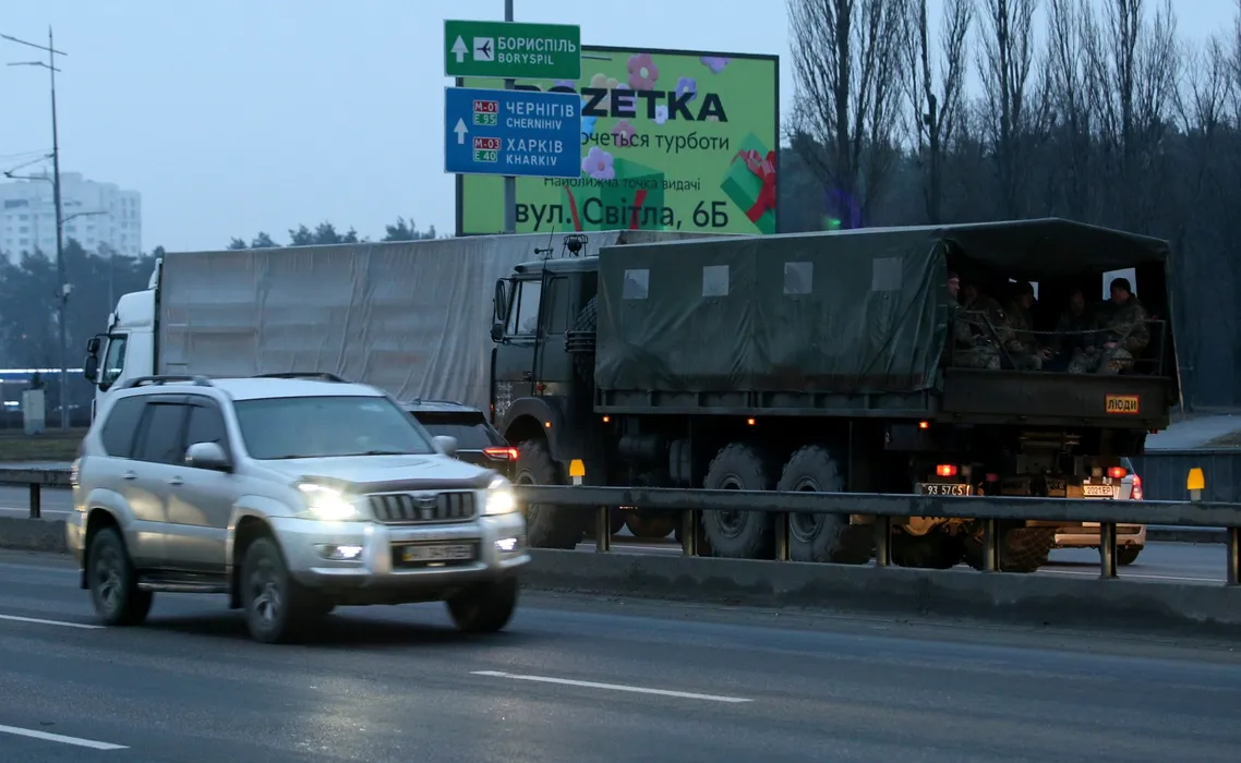 8124766 24.02.2022 Ukrainian servicemen ride in the back of a military truck in Kiev, Ukraine. On February 24 Russian President Vladimir Putin announced a military operation in Ukraine following recognition of independence of breakaway Donbas republics.,Image: 664573179, License: Rights-managed, Restrictions: , Model Release: no, Credit line: Profimedia