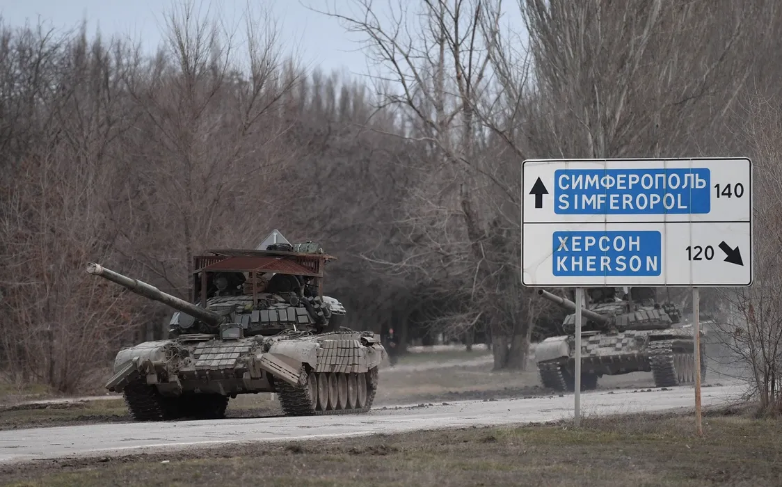 8125653 24.02.2022 T-72 tanks drive along a road at the Dzhankoy checkpoint in the northern part of Crimea, Russia. On February 24 Russian President Vladimir Putin announced a military operation in Ukraine following recognition of independence of breakaway Donbas republics. Konstantin Mihalchevskiy / Sputnik
