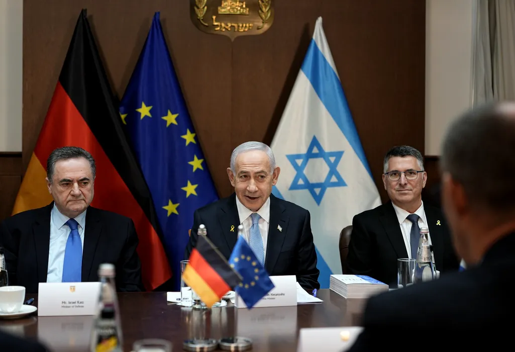 07 December 2025, ---, Jerusalem: German Chancellor Friedrich Merz (front) sits opposite Benjamin Netanyahu (C), Prime Minister of Israel, as well as Defense Minister Israel Katz (L) and Foreign Minister Gideon Saar during talks at the seat of government. Merz's inaugural visit to Israel will focus on stabilizing the ceasefire in Gaza and the ongoing peace process and German-Israeli relations. Photo: Michael Kappeler/dpa