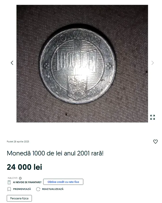 Moneda de o mie de lei din 2001 se vinde la diverse prețuri, pe internet / sursă foto: Olx