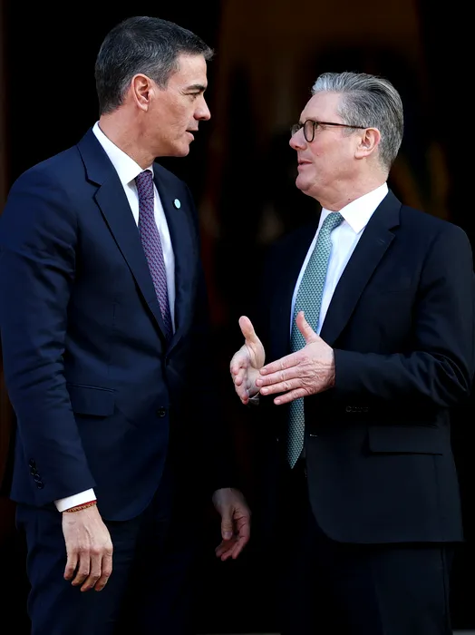 02 March 2025, United Kingdom, London: UK Prime Minister Sir Keir Starmer (R) welcomes Spanish Prime Minister Pedro Sanchez to Lancaster House, for a European leaders' summit on the situation in Ukraine. Photo: Toby Melville/PA Wire/dpa