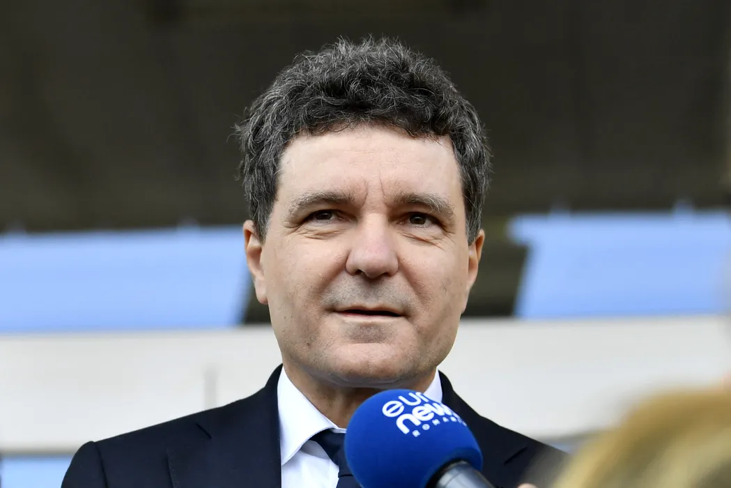 FAGARAS, ROMANIA - MAY 18: Presidential candidate Nicusor Dan speaks to the press near a polling station during the second round of the country's presidential election in Fagaras, Romania, 18 May 2025. Alex Nicodim / Anadolu/ABACAPRESS.COM