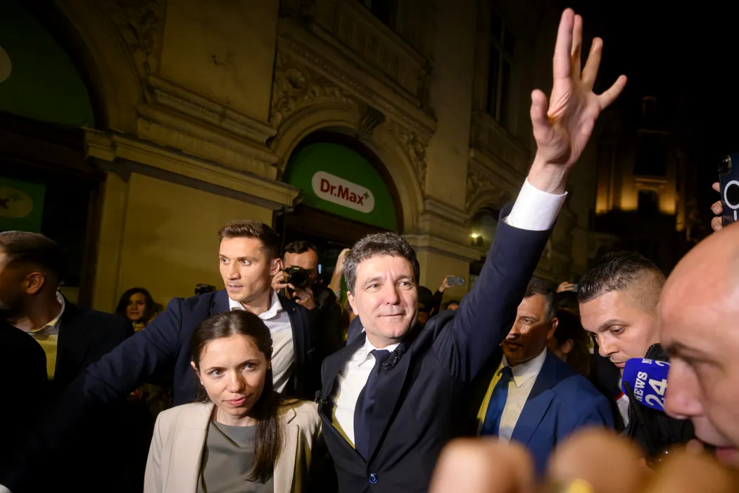 Candidatul independent la alegerile prezidentiale, Nicusor Dan, saluta multimea inainte de o declaratie de presa dupa castigarea celui de-al doilea tur, in Bucuresti, luni 19 mai 2025. ALEXANDRU DOBRE / MEDIAFAX FOTO.