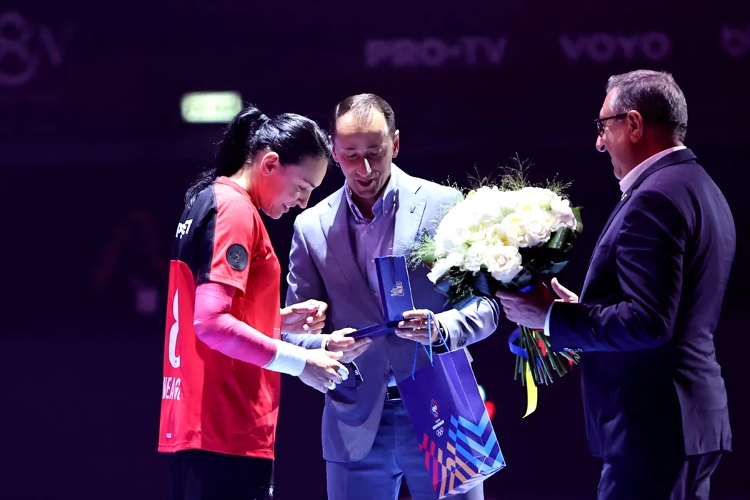 Meciul de retragere din activitatea competitionala a handbalistei Cristina Neagu din cadrul ,,Galei Neagu - Retragerea unei legende'', disputat la Sala Polivalenta din Bucuresti, duminica, 8 iunie 2025. In imagine: Cristina Neagu si Mihai Covali, presedinte COSR. GEORGE FLUSTER / MEDIAFAX FOTO