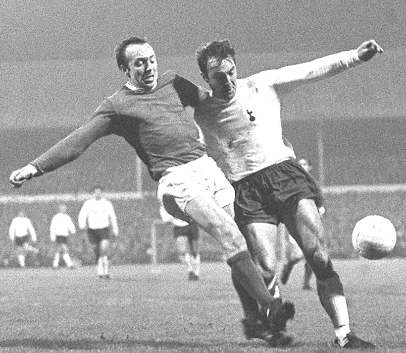 File photo dated 9-10-1968 of Manchester United's Nobby Stiles (left) and Tottenham Hotspur's Jimmy Greaves in a tussle for the ball during the First Division match at White Hart Lane, London.,Image: 566457570, License: Rights-managed, Restrictions: FILE PHOTO, Model Release: no, Credit line: Profimedia