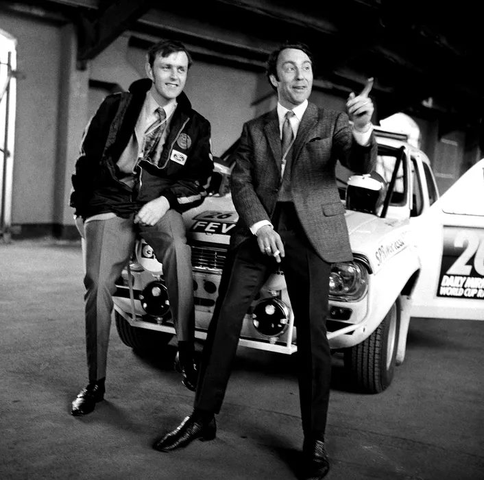 File photo dated 18-04-1970 of Co driver Tony Fall (left) and West Ham United and England player Jimmy Greaves during scrutineering at Wembley prior to the 16,000 mile rally Issue date: Sunday September 19, 2021.,Image: 632839326, License: Rights-managed, Restrictions: FILE PHOTO, Model Release: no, Credit line: Profimedia