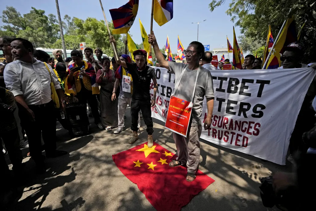 Tibetan youth activists stand on a Chinese flag and protest against the visit of the Chinese delegation to participate in the G20 Summit in New Delhi, India, Friday, Sept. 8, 2023. (AP Photo/Channi Anand)