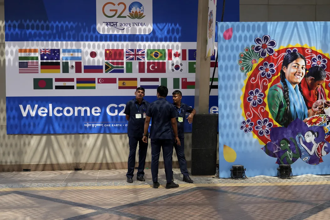 Security officers stand guard at the main venue of the G20 Summit, in New Delhi, India, Friday, Sept. 8, 2023. (AP Photo/Manish Swarup)