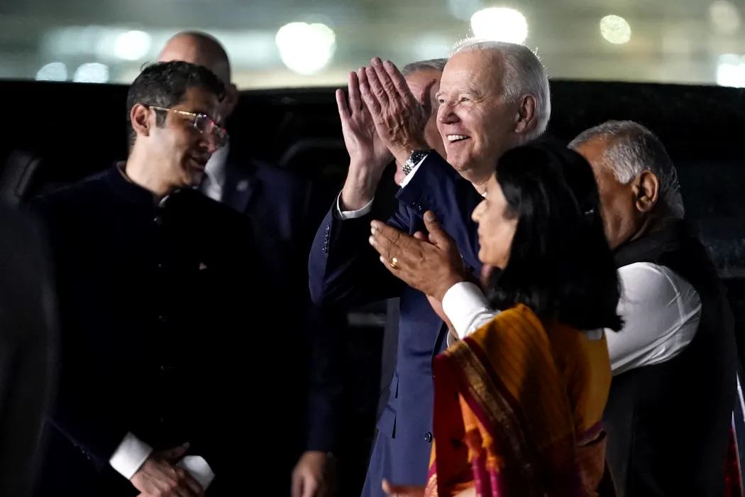 President Joe Biden smiles after arriving at Indira Gandhi International Airport to attend the G20 summit, Friday, Sept. 8, 2023, in New Delhi. (AP Photo/Evan Vucci)