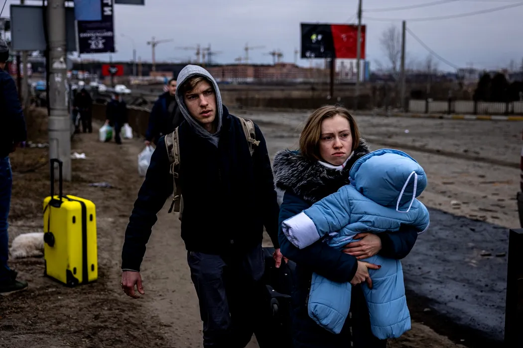 A woman carries her child as they flee the city of Irpin, northwest of Kyiv, on March 7, 2022. Ukraine dismissed Moscow's offer to set up humanitarian corridors from several bombarded cities on Monday after it emerged some routes would lead refugees into Russia or Belarus. The Russian proposal of safe passage from Kharkiv, Kyiv, Mariupol and Sumy had come after terrified Ukrainian civilians came under fire in previous ceasefire attempts.,Image: 666793292, License: Rights-managed, Restrictions: , Model Release: no, Credit line: Profimedia