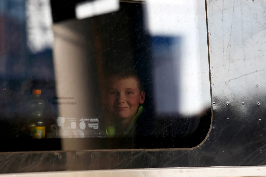 A child smiles through a train window while leaving Kyiv to west of Ukraine by a train because of the war in eastern part of Ukraine and around Kyiv.,Image: 669271125, License: Rights-managed, Restrictions: *** World Rights ***, Model Release: no, Credit line: Profimedia