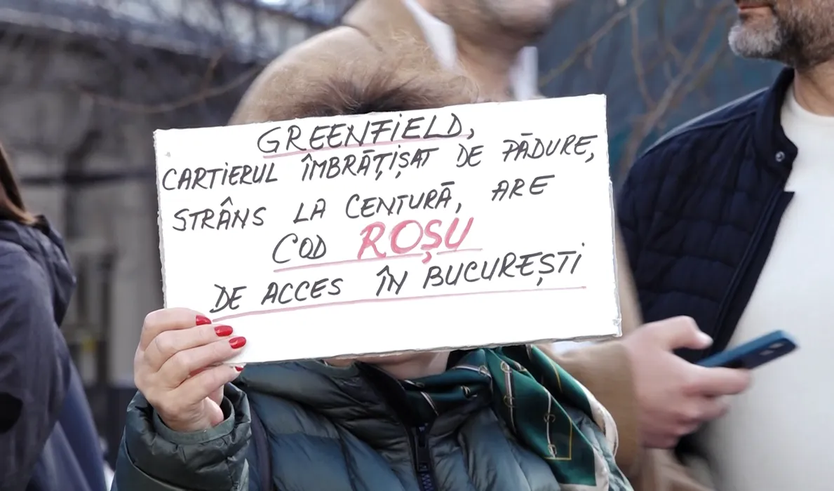 GALERIE FOTO: EXCLUSIV VIDEO | Zeci de locuitori ai cartierului Greenfield Băneasa au protestat la Primăria Sectorului 1. „Copiii mei au pături în mașină și dorm o oră și ceva până ajungem la grădiniță și la școală. Primarul Clotilde Armand nu ne respectă”