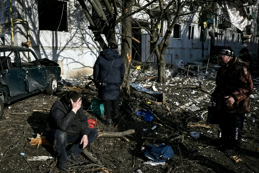 People stand by the body of a relative stretched out on the ground after bombings on the eastern Ukraine town of Chuguiv on February 24, 2022, as Russian armed forces are trying to invade Ukraine from several directions, using rocket systems and helicopters to attack Ukrainian position in the south, the border guard service said. Russia's ground forces on Thursday crossed into Ukraine from several directions, Ukraine's border guard service said, hours after President Vladimir Putin announced the launch of a major offensive. Russian tanks and other heavy equipment crossed the frontier in several northern regions, as well as from the Kremlin-annexed peninsula of Crimea in the south, the agency said.,Image: 664593200, License: Rights-managed, Restrictions: , Model Release: no, Credit line: Profimedia