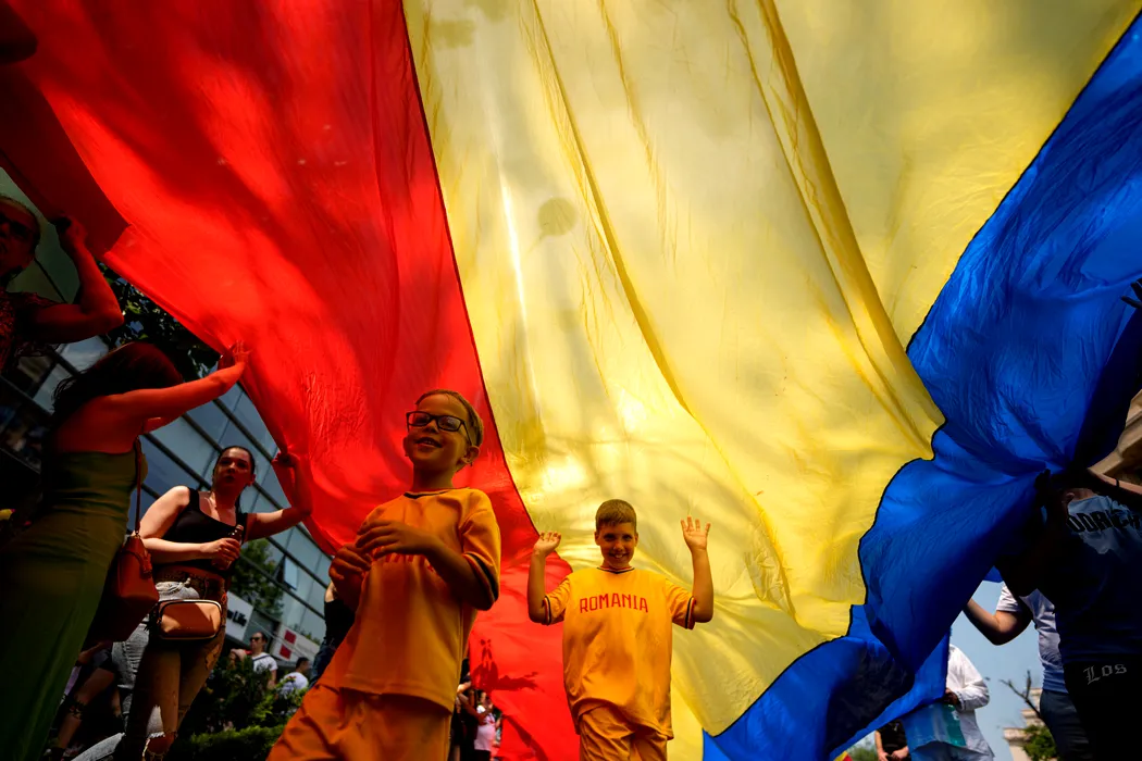 Copii alearga sub un steag tricolor in timpul ”Marsului Normalitatii”, care sustine familia formata dintre un barbat si o femeie in Bucuresti, sambata, 7 iunie 2025. Cateva sute de persoane au participat la Marsul normalitatii, care sustine familia formata dintre un barbat si o femeie. ANDREEA ALEXANDRU / MEDIAFAX FOTO