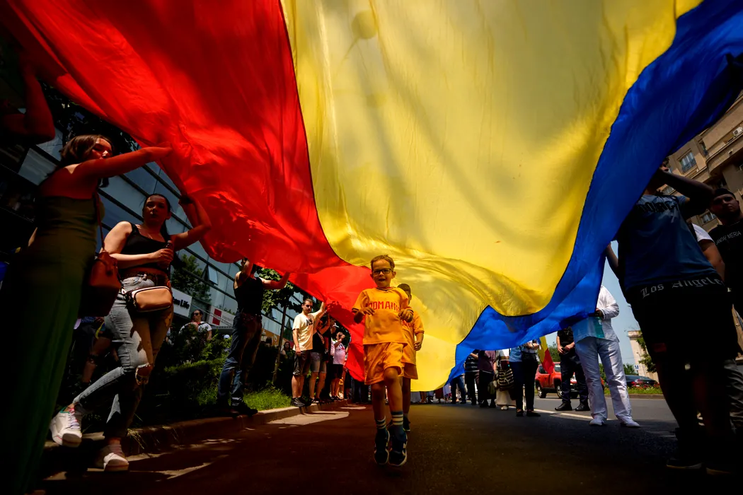 Copii alearga sub un steag tricolor in timpul ”Marsului Normalitatii”, care sustine familia formata dintre un barbat si o femeie in Bucuresti, sambata, 7 iunie 2025. Cateva sute de persoane au participat la Marsul normalitatii, care sustine familia formata dintre un barbat si o femeie. ANDREEA ALEXANDRU / MEDIAFAX FOTO