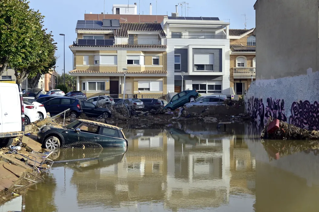 Wreckage of cars pile up in a street on October 31, 2024 after flash floods affected the town of Alfafar, in the region of Valencia, eastern Spain. Rescuers raced on October 31, 2024 to find survivors and victims of once-in-a-generation floods in Spain that killed at least 95 people and left towns submerged in a muddy deluge with overturned cars scattered in the streets. About 1,000 troops joined police and firefighters in the grim search for bodies in the Valencia region as Spain started three days of mourning. Up to a year's rain fell in a few hours on the eastern city of Valencia and surrounding region on October 29 sending torrents of water and mud through towns and cities.,Image: 928607158, License: Rights-managed, Restrictions: , Model Release: no
