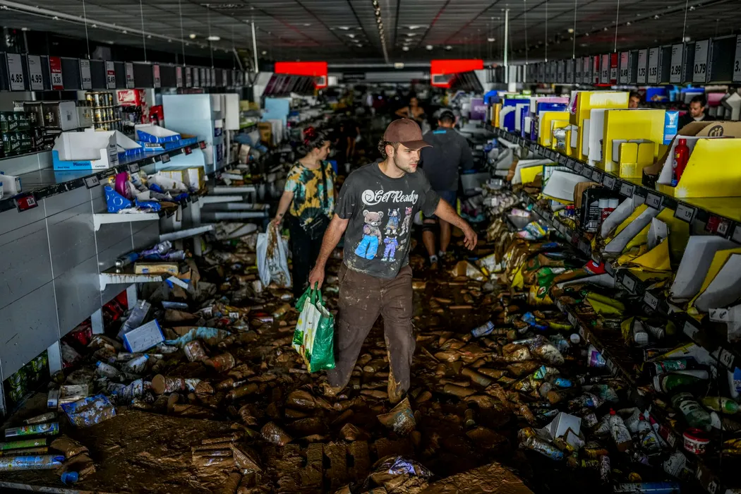 People pick up goods in a supermarket affected by the floods in Valencia, Spain, Thursday, Oct. 31, 2024.,Image: 928616872, License: Rights-managed, Restrictions: This content is intended for editorial use only. For other uses, additional clearances may be required., Model Release: no