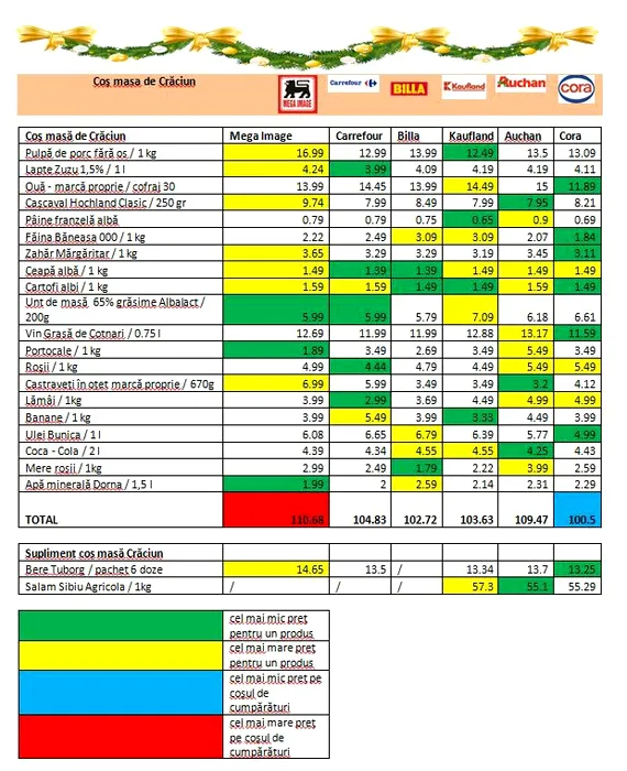 Masa de Crăciun. Cât costă ACELAȘI COȘ DE PRODUSE la Mega Image, Billa, Auchan, Carrefour, Cora și Kaufland