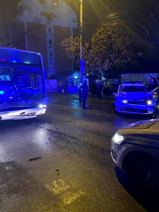 Mașină de poliție lovită de autobuz, în Capitală! Doi agenți primesc îngrijiri medicale / FOTO