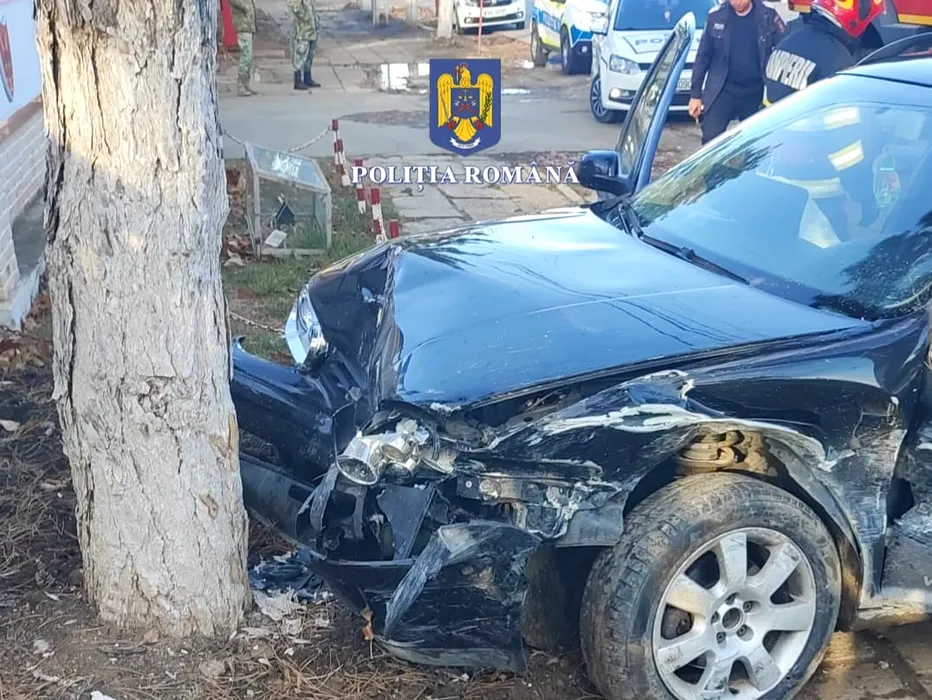 Mașină FURATĂ din Caracal, urmărită cu focuri de armă. Bărbatul de la volan a reușit să lovească cinci autoturisme parcate și două mașini de poliție