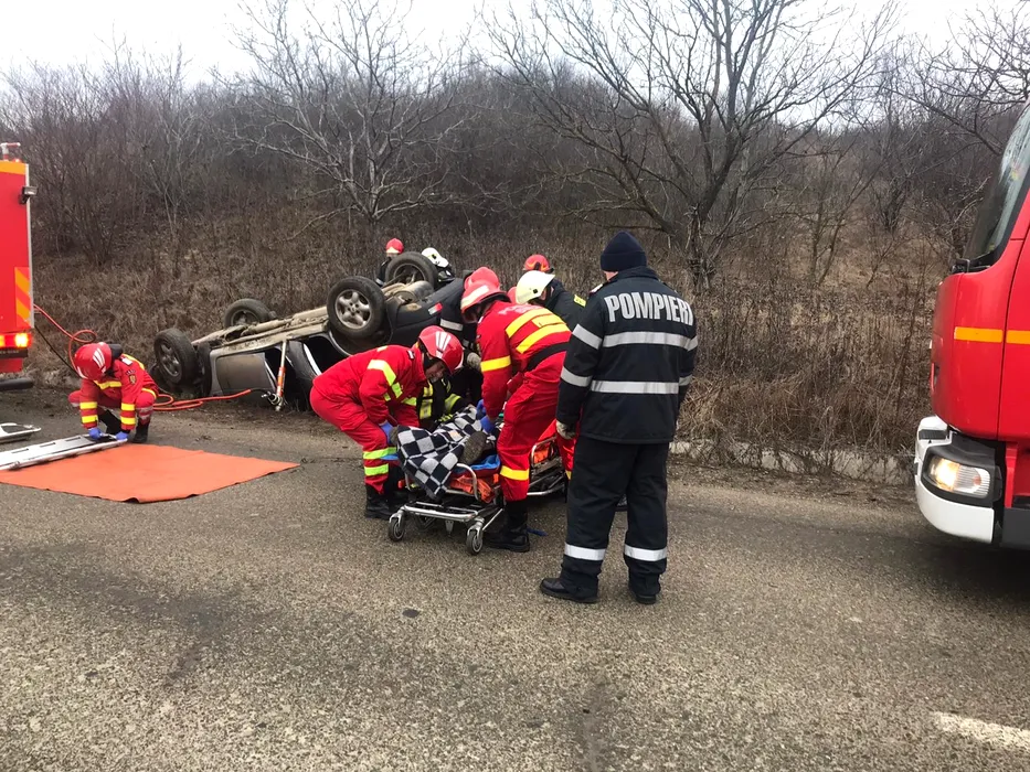 Mașină răsturnată, cu victime blocate înăuntru. Imagini horror