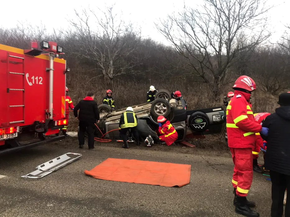 Mașină răsturnată, cu victime blocate înăuntru. Imagini horror