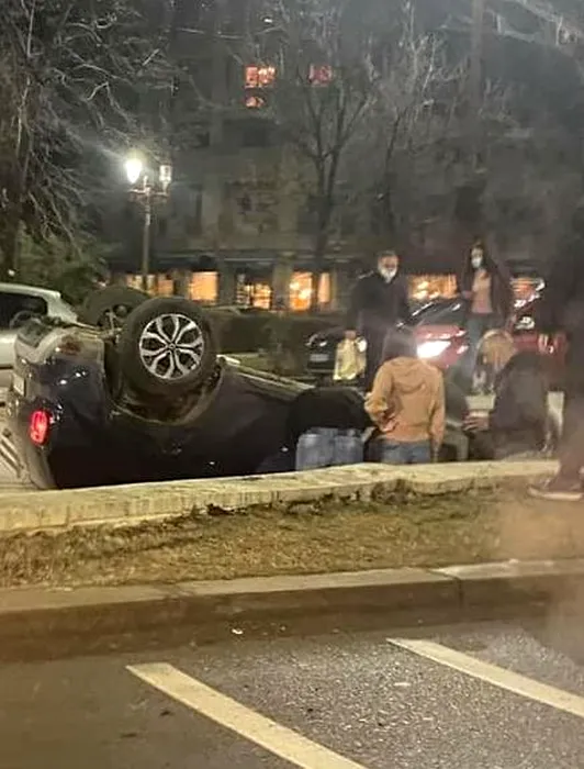Mașină răsturnată în Capitală, într-o fântână arteziană din Piața Unirii. E a treia, în mai puțin de o săptâmână! Pilotul Sorin Ene știe ce i-a păcălit pe șoferi (VIDEO)