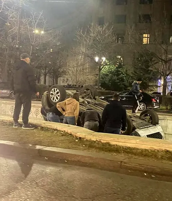 Mașină răsturnată în Capitală, într-o fântână arteziană din Piața Unirii. E a treia, în mai puțin de o săptâmână! Pilotul Sorin Ene știe ce i-a păcălit pe șoferi (VIDEO)