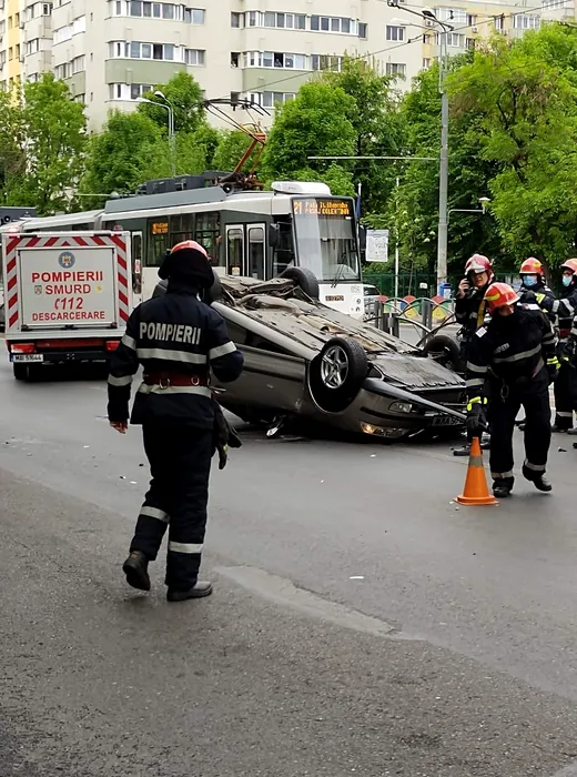 Mașină răsturnată pe Șoseaua Colentina, după impactul cu un alt autoturism. Traficul auto în zona accidentului a fost deviat (FOTO)