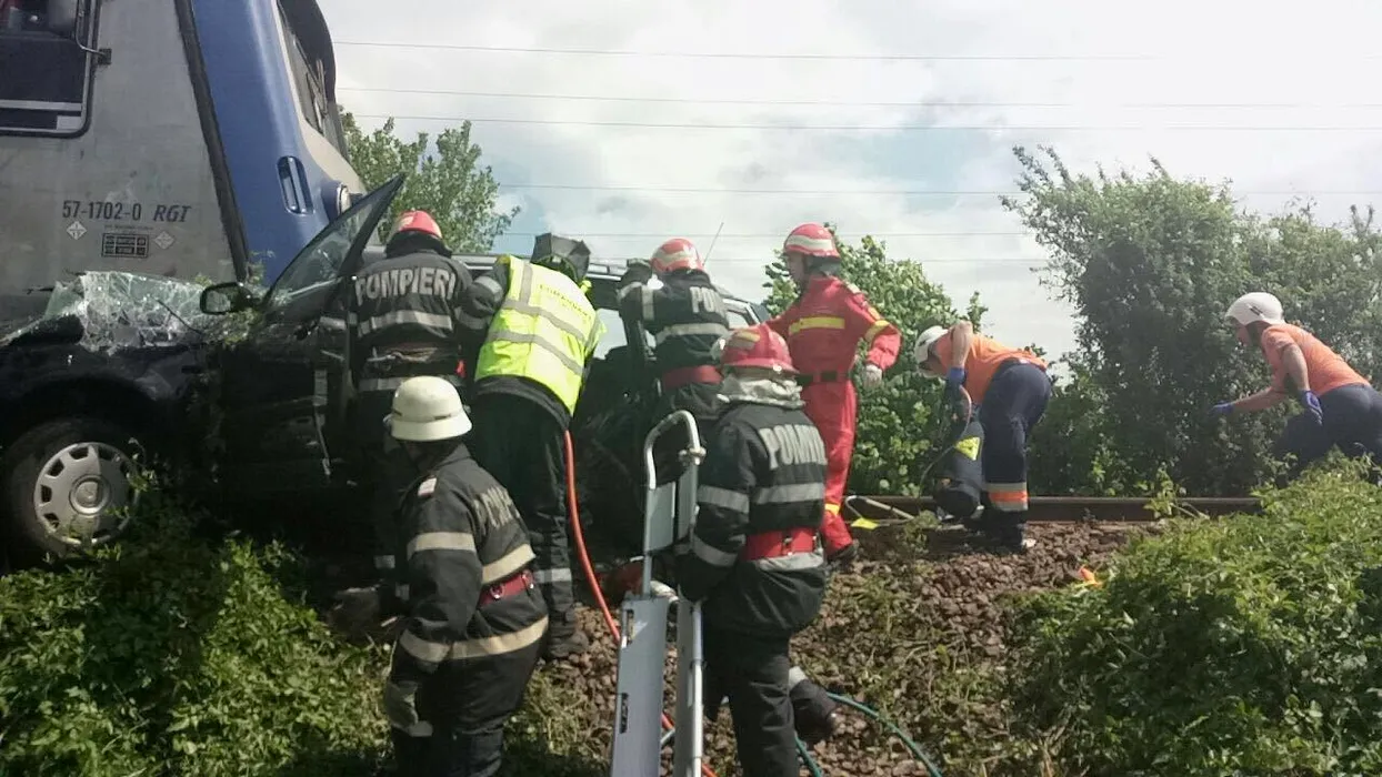 Mașină spulberată de tren în Bistrița, după ce o șoferiță n-a oprit la semnal: cinci oameni au murit, patru dintre ei fiind frați. VIDEO și FOTO