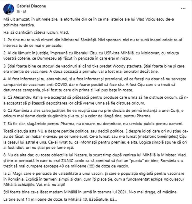 Medicul Diaconu, ex-consilierul lui Rafila, îi răspunde lui Voiculescu în scandalul vaccinurilor: „Vlad, pe tine nu te sună nimeni din minister”