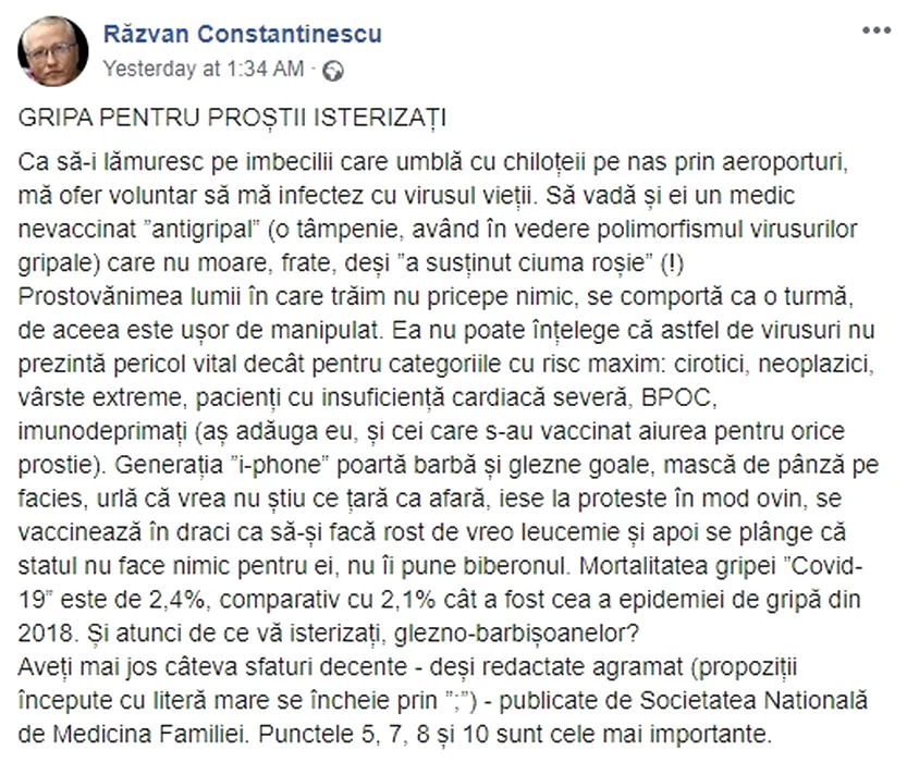 Medicul român care i-a numit pe protestarii din Piața Victoriei „boi” lovește din nou! Despre cei ce poartă măști medicale: „Imbecili care umblă cu chiloțeii pe nas”