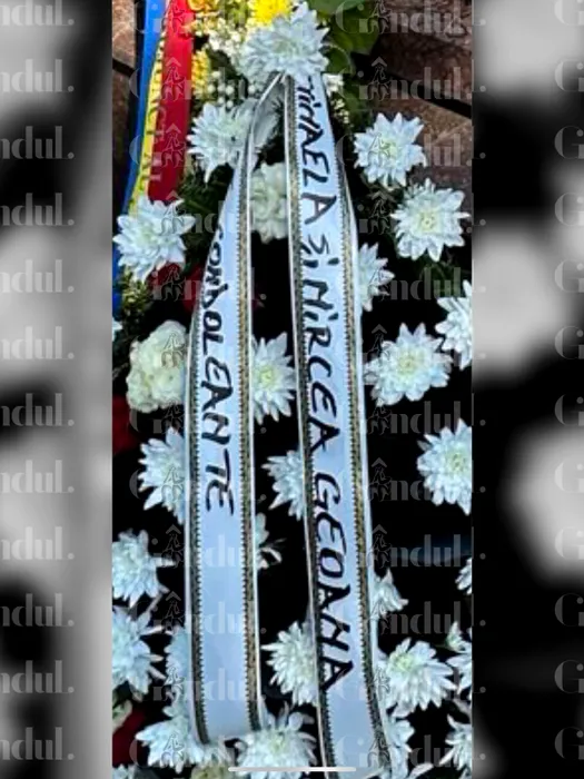 Una dintre coroanele aduse la cimitir poartă pe ea un mesaj de condoleanțe din partea familiei lui Mircea Geoană