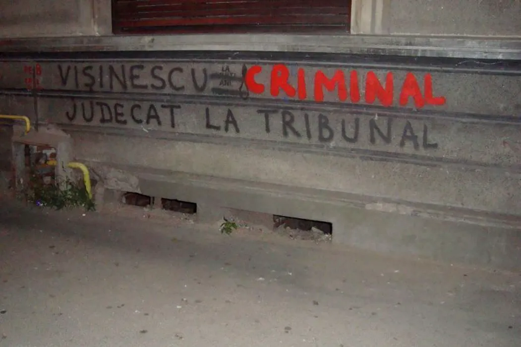 Mesaj pentru torționarul Vișinescu, scris pe blocul lui: „Torționare, ești acasă? Morții nu te lasă”