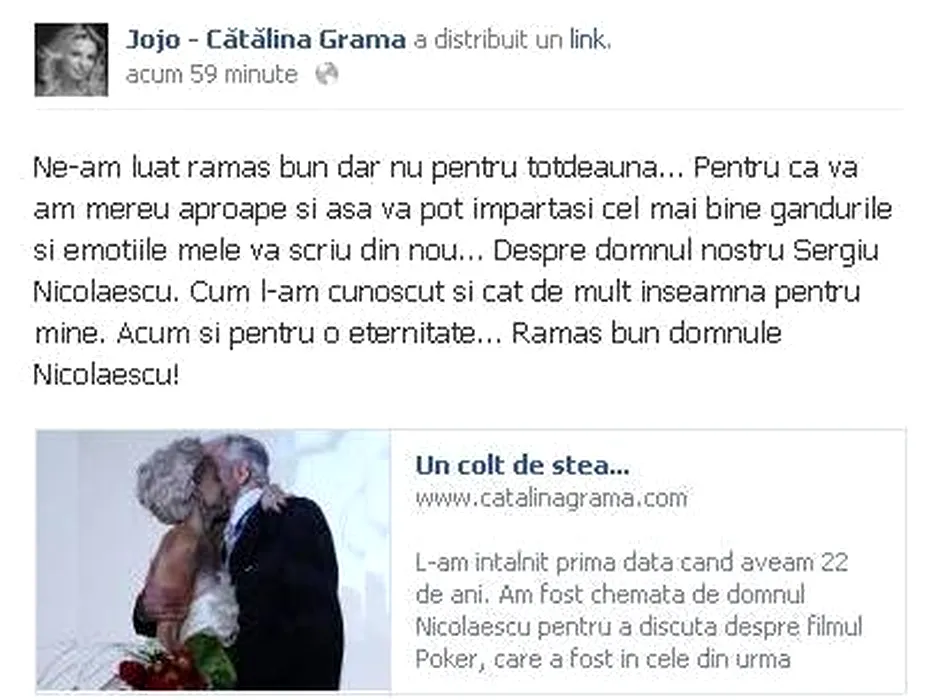 Mesajul de adio pentru Sergiu Nicolaescu, postat de Jojo pe pagina de Facebook
