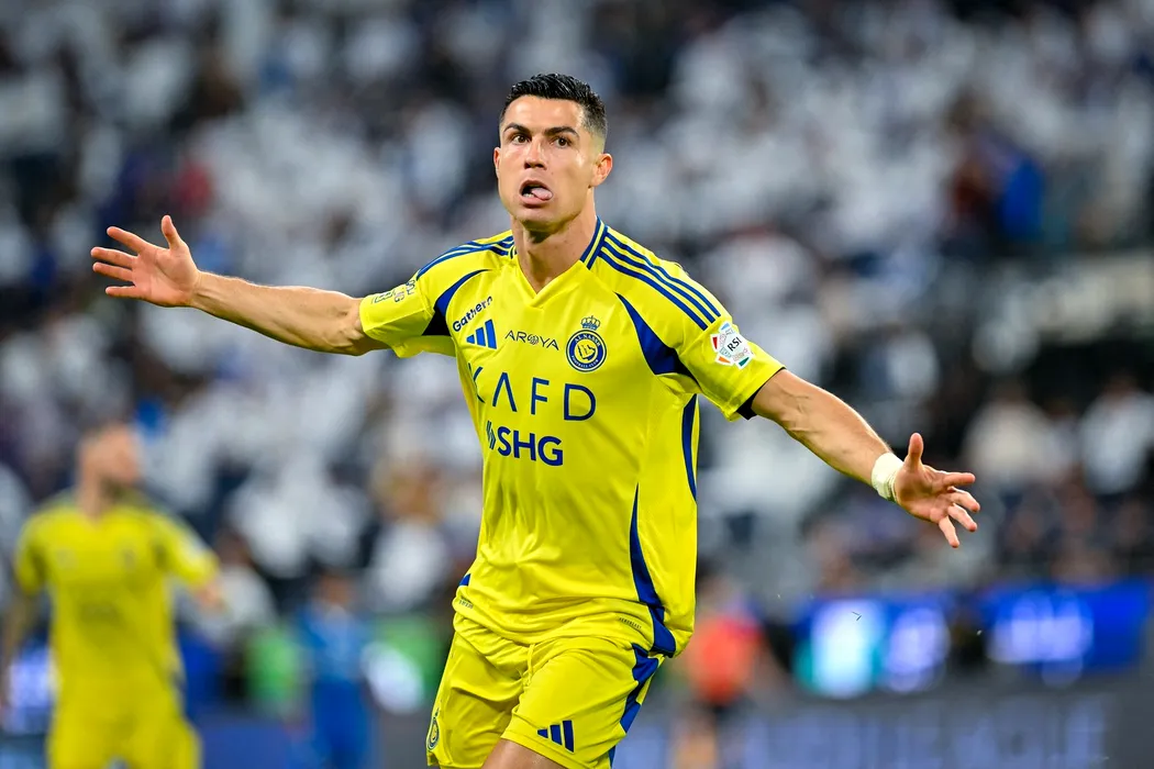 Cristiano Ronaldo de la Al Nassr sărbătorește după ce a marcat un gol în timpul meciului din Saudi Pro League dintre Al Hilal și Al Nassr pe Kingdom Arena, pe 04 aprilie 2025, la Riyadh, Arabia Saudită.