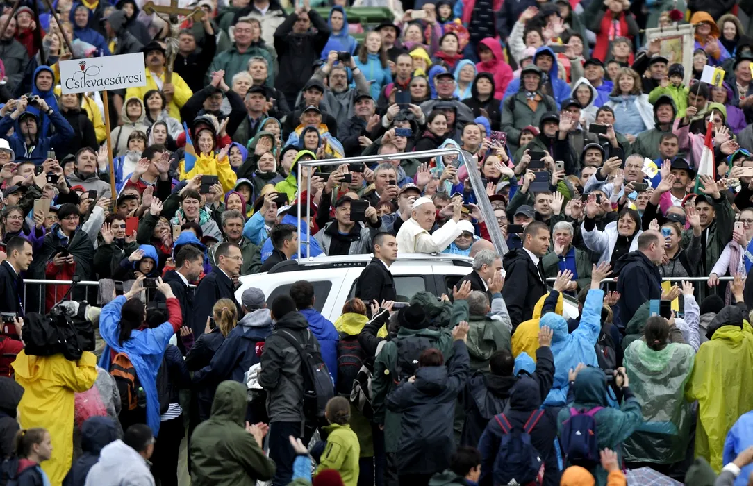 Pope Francis arrives to celebrate Mass at the Marian shrine, in Sumuleu Ciuc, Romania, Saturday, June 1, 2019. Francis began a three-day pilgrimage to Romania on Friday that in many ways is completing the 1999 trip by St. John Paul II that marked the first-ever papal visit to a majority Orthodox country.,Image: 574390308, License: Rights-managed, Restrictions: This content is intended for editorial use only. For other uses, additional clearances may be required., Model Release: no, Pictured: Pope Francis,Pope John Paul II