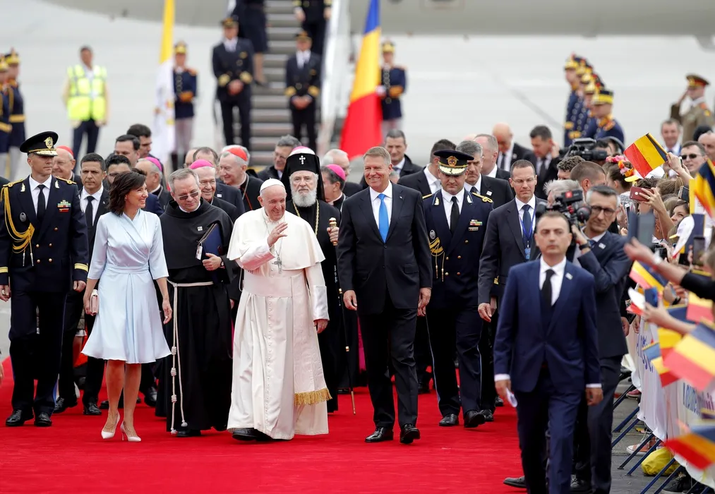 Pope Francis, flanked by Romanian President Klaus Iohannis, right, and his wife Carmen, left, waves upon his arrival from Rome at Henri Coanda International Airport in Otopeni, near Bucharest, Romania, Friday, May 31, 2019. Pope Francis is heading to Romania for a three-day, cross-country pilgrimage that in many ways is completing the 1999 trip by St. John Paul II that marked the first-ever papal visit to a majority Orthodox country.,Image: 574395056, License: Rights-managed, Restrictions: This content is intended for editorial use only. For other uses, additional clearances may be required., Model Release: no, Pictured: Klaus Iohannis,Pope Francis,Pope John Paul II
