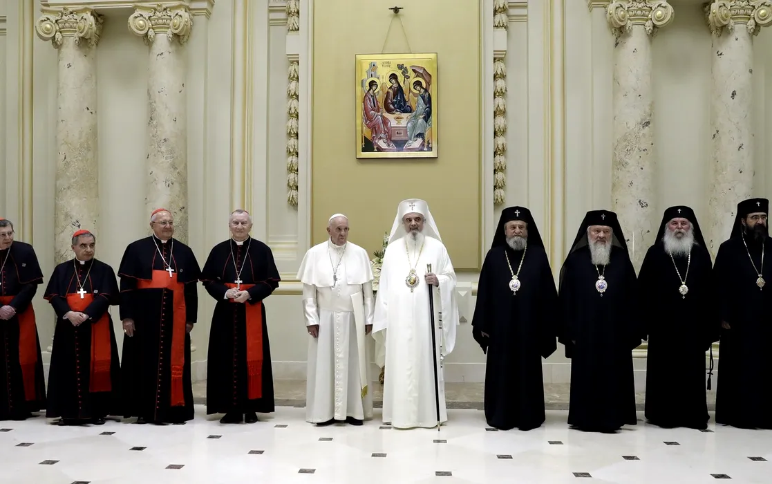 Pope Francis poses for a photo with Romanian Orthodox Patriarch Daniel, fifth from right, at the Romanian Patriarchy, in Bucharest, Romania, Friday, May 31, 2019. Others are unidentified members of their delegations. Francis began a three-day pilgrimage to Romania on Friday that in many ways is completing the 1999 trip by St. John Paul II that marked the first-ever papal visit to a majority Orthodox country.,Image: 574394449, License: Rights-managed, Restrictions: This content is intended for editorial use only. For other uses, additional clearances may be required., Model Release: no, Pictured: Pope Francis,Pope John Paul II