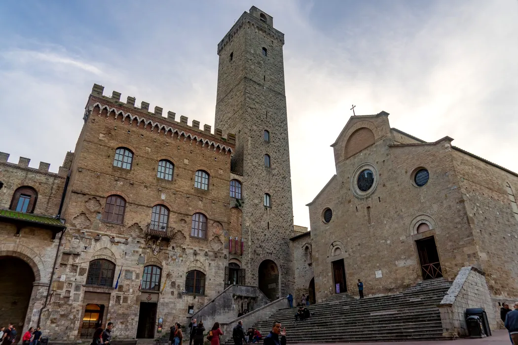 Facade of the Palazzo Comunale, Torre Grossa & Collegiata di Santa Maria Assunta Church. San Gimingnano, Italy.,Image: 950902999, License: Rights-managed, Restrictions: , Model Release: no