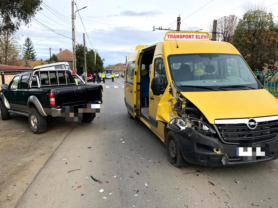 Microbuz școlar care transporta 12 elevi, lovit de o mașină în județul Arad – FOTO