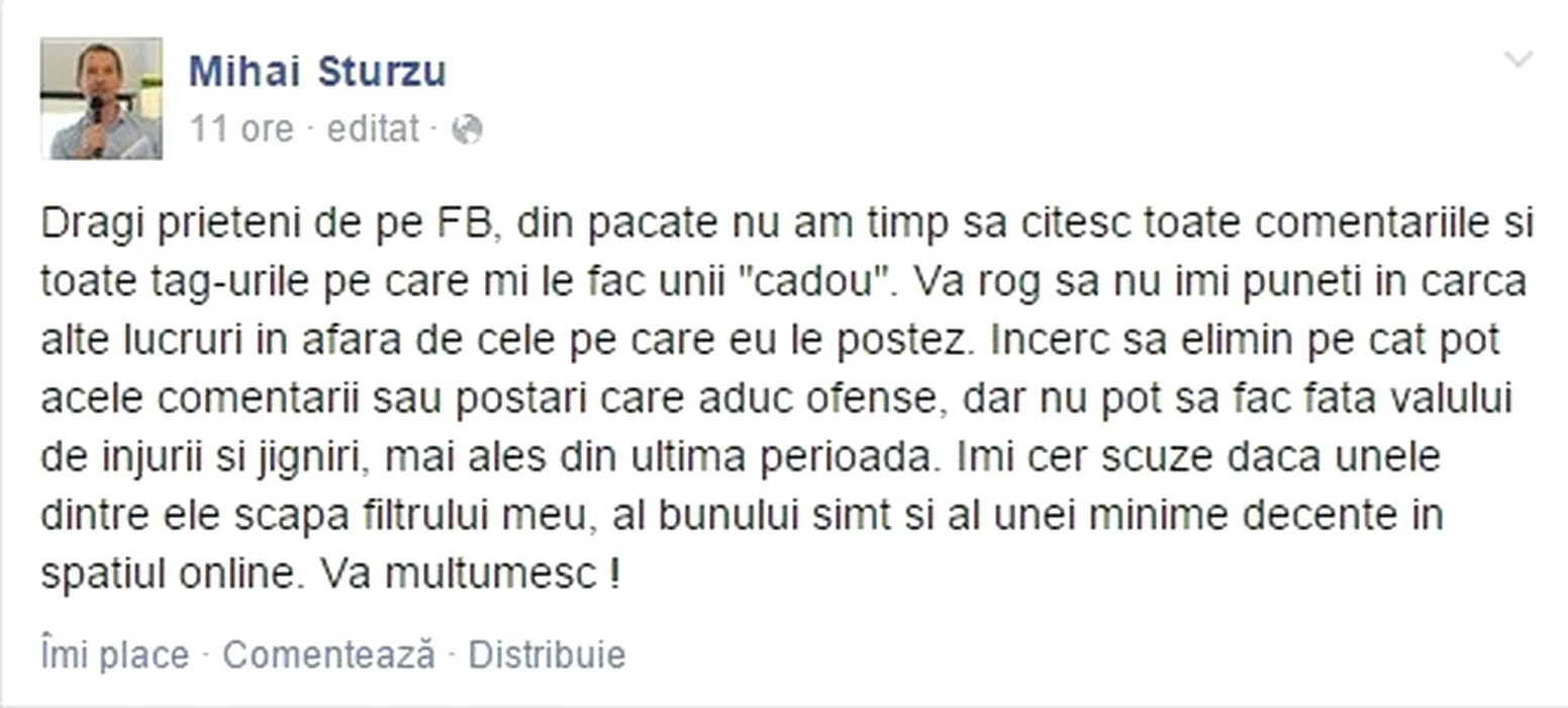 Mihai Sturzu – somat de Centrul pentru Combaterea Discriminării să scoată o fotografie de pe Facebook