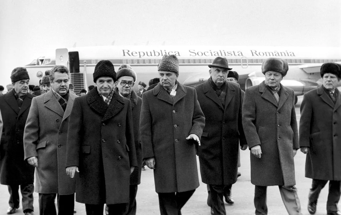Moscow. USSR. The Romanian Communist Party delegation arrived at the celebration of the USSR 60th anniversary. CPSU Secretary General Mikhail Gorbachev (R, foreground) and Nicolae Ceausescu, General Secretary of the Romanian Communist Party, in the airport. Photo TASS / Viktor Koshevoi; Valentin Mastyukov