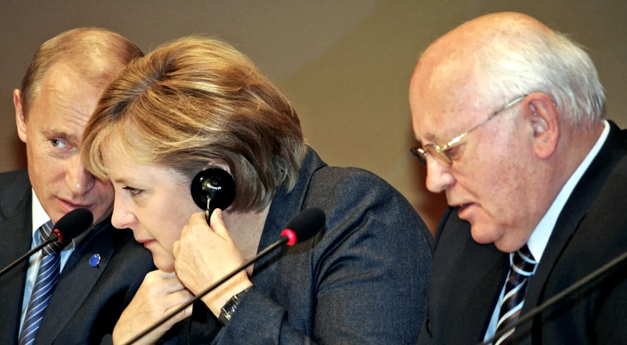 Russian President Vladimir Putin (L), German Chancellor Angela Merkel (C) and former Soviet leader Mikhail Gorbachev (R) talk during a conference called the Petersburg Dialogue 15 October 2007 in Wiesbaden. Merkel urged Putin to work with Europe to find solutions to global problems at a time when Russia and the West are increasingly at odds. AFP PHOTO / RIA NOVOSTI / KREMLIN POOL / MIKHAIL KLIMENTYEV,Image: 22894140, License: Rights-managed, Restrictions: , Model Release: no