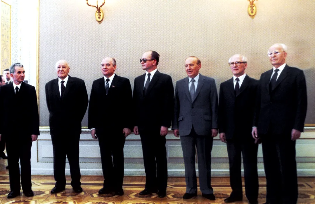From right to left : Romania's President Nicolae Ceausescu, Hungary's Janos Kadar, Soviet Mikhail Gorbachev, Polish Prime Minister Wojciech Jaruzelski, Todor Zhivkov of Bulgaria, Erich Honecker of East Germany and Gustav Husak of Czechoslovakia.,Image: 68345814, License: Rights-managed, Restrictions: , Model Release: no