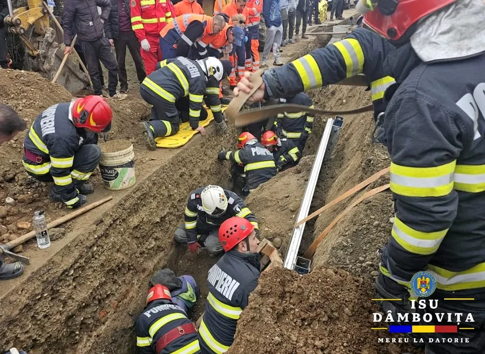 MISIUNEA de salvare din Dâmbovița, încheiată. Cele două persoane prinse sub șanțul de pământ, scoase la suprafață / Operațiune de amploare