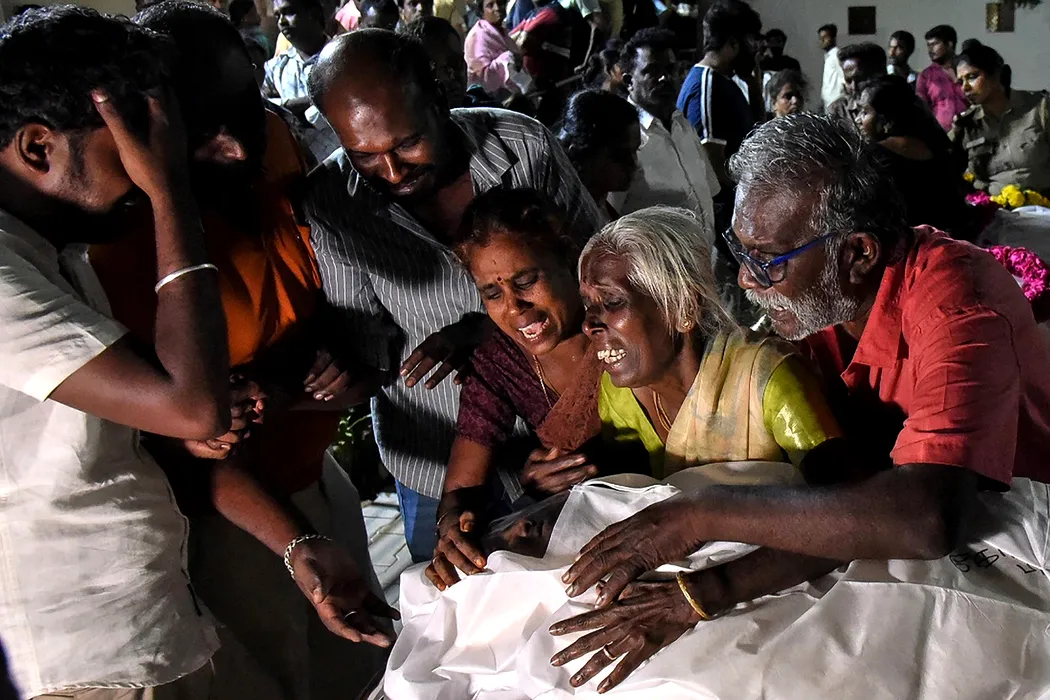 Relatives mourn after receiving the dead body of a victim who was killed in a stampede that broke out during a campaign rally last evening in the Karur district, in the Indian state of Tamil Nadu, on September 28, 2025. At least 36 people were killed on September 27 after a stampede broke out at a campaign rally of popular actor-turned-politician Vijay in Tamil Nadu, the state's chief minister said.,Image: 1041265556, License: Rights-managed, Restrictions: ALTERNATE CROP, Model Release: no
